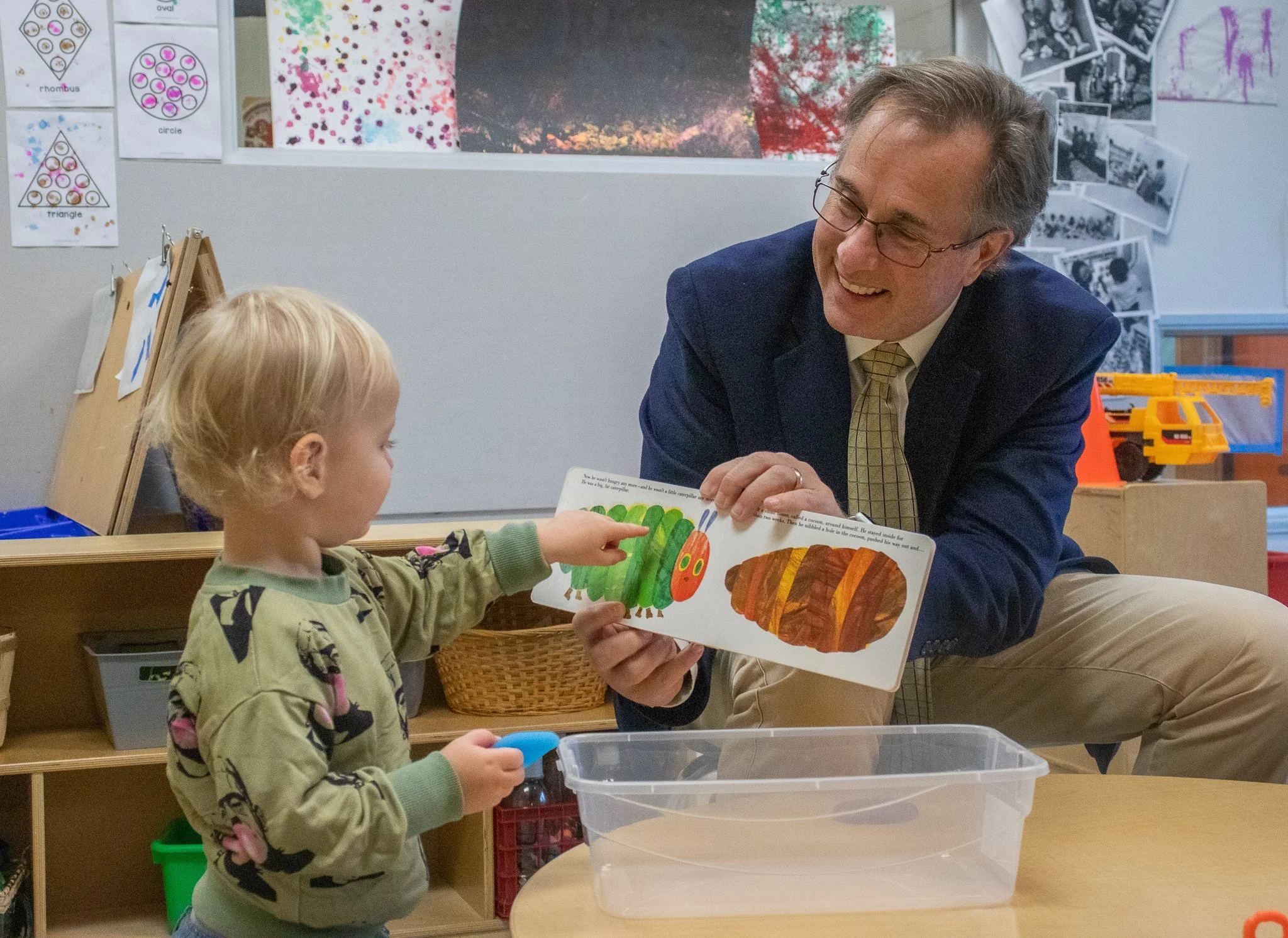 Paul Petruska and a toddler enjoying The Very Hungry Caterpillar.