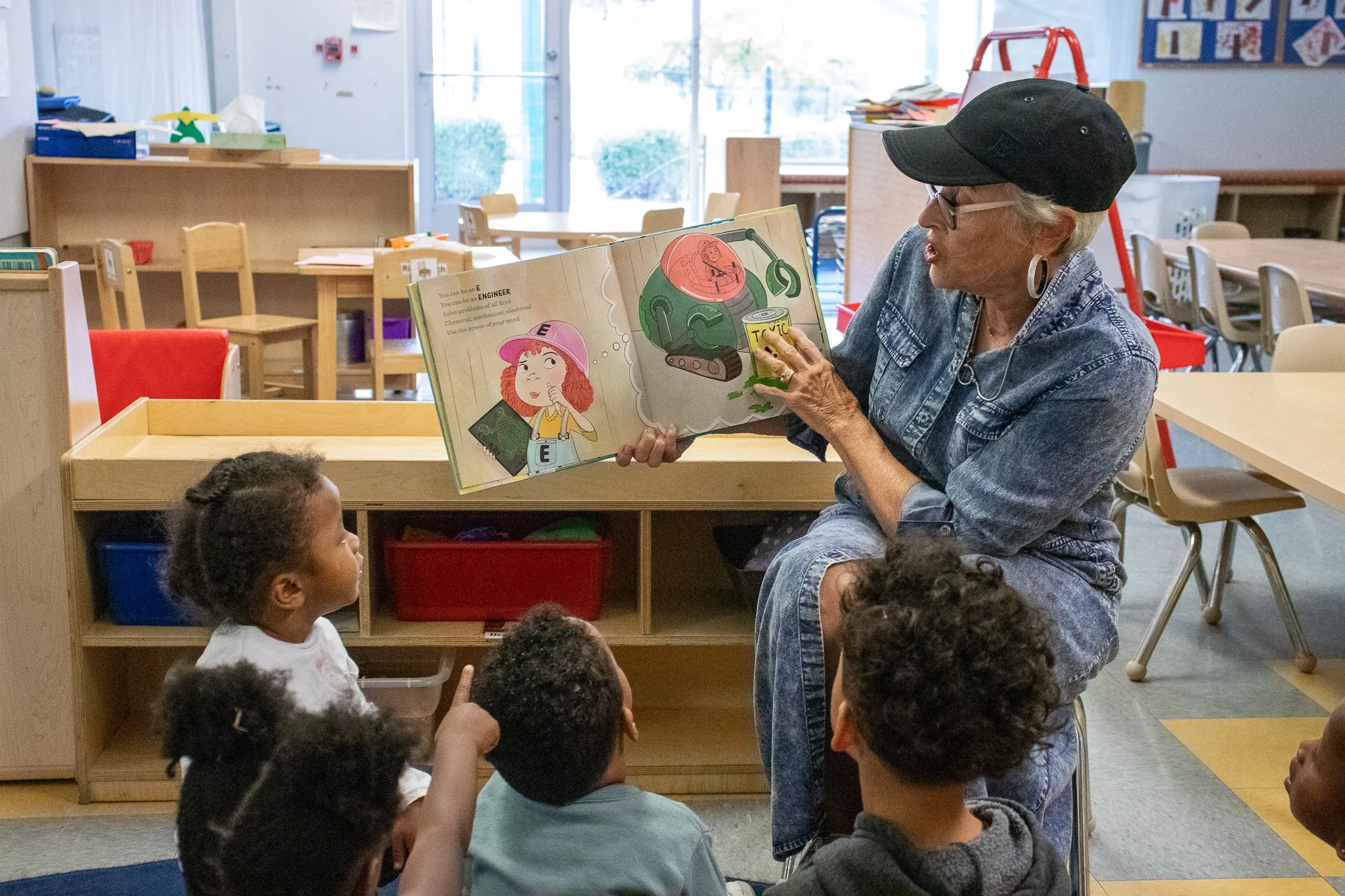 Alison Ferring sharing different occupations in a storybook with River Birch preschoolers.