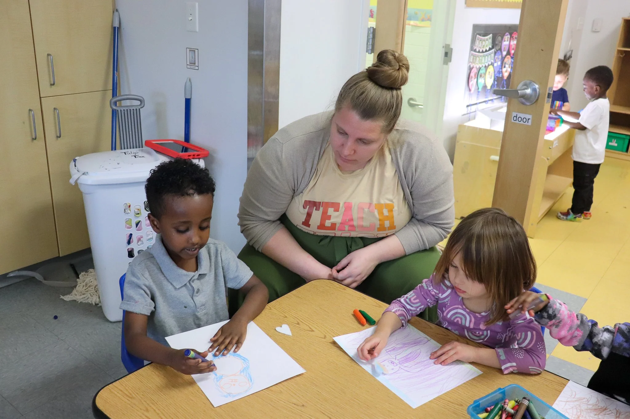 Preschool educator, Ms. Lauren, listening to children describe their drawing.